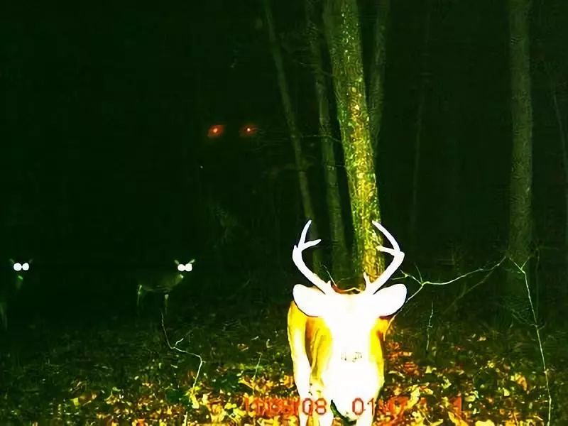 这张照片,里面有三只鹿,它们同时看着相机,这很不寻常。鹿通常不会同时朝同一方向看。在图片中间,顶部,您可以看到两个红灯发光。没错,它们正在发光,你甚至可以看见它照亮了鹿周围的树叶,并反射出红光。